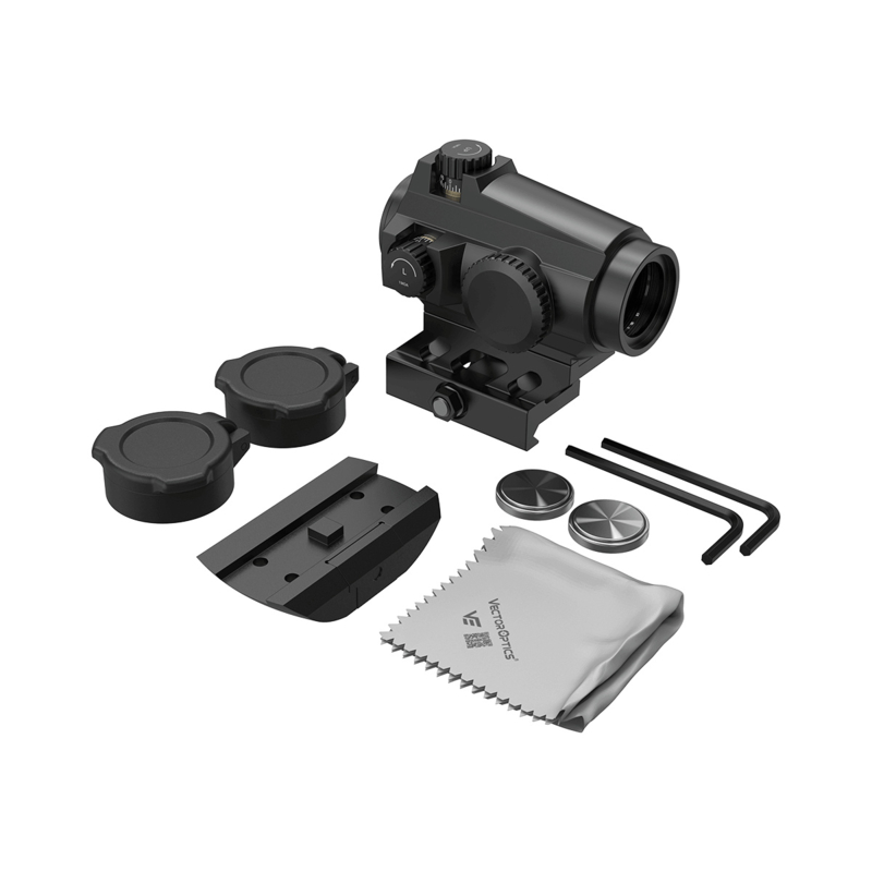Extra accessoires: Cantilever QD Picatinny montage, lage Picatinny montage, flip-up kap, inbussleutels en reinigingsdoekje