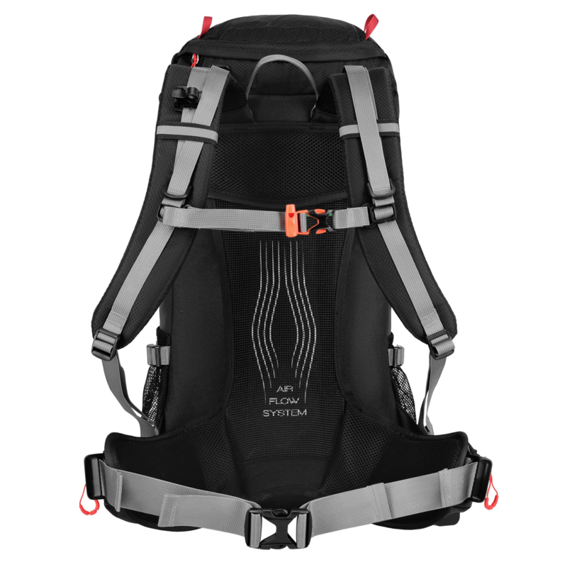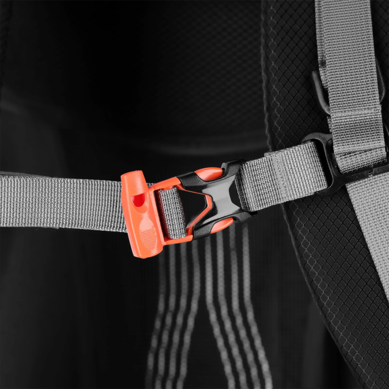 Een geïntegreerd reddingsfluitje is op de borstbandgesp geplaatst, wat de veiligheid van de gebruiker vergroot. Een extra paneel met handgrepen stelt u in staat om bijvoorbeeld wandelstokken of andere accessoires te bevestigen. De rugzak heeft ook twee mesh zijvakken en een ritsvak op de heupband, ideaal voor een telefoon of andere kleine spullen.